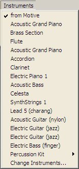 Pitched sounds may be selected directly in the Instruments pop-down menu. Percussion sounds may be selected by first choosing "Percussion Kit" from the Instruments pop-down menu and then selecting the desired instrument from the percussion sub-menu. If an unpitched percussion sound is selected, pitched information in the motive or stroke will be ignored.