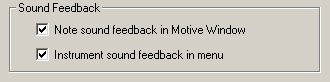 If the 'Note sound feedback in the motive window' box is checked, you will hear the note pitch sound every time you move a note up or down. If the 'Instrument sound feedback in menu' box is checked, you will hear the instrument sound timbre of each instrument as you scroll through the menu. Either item may be turned off by simply unchecking the apropriate box.
